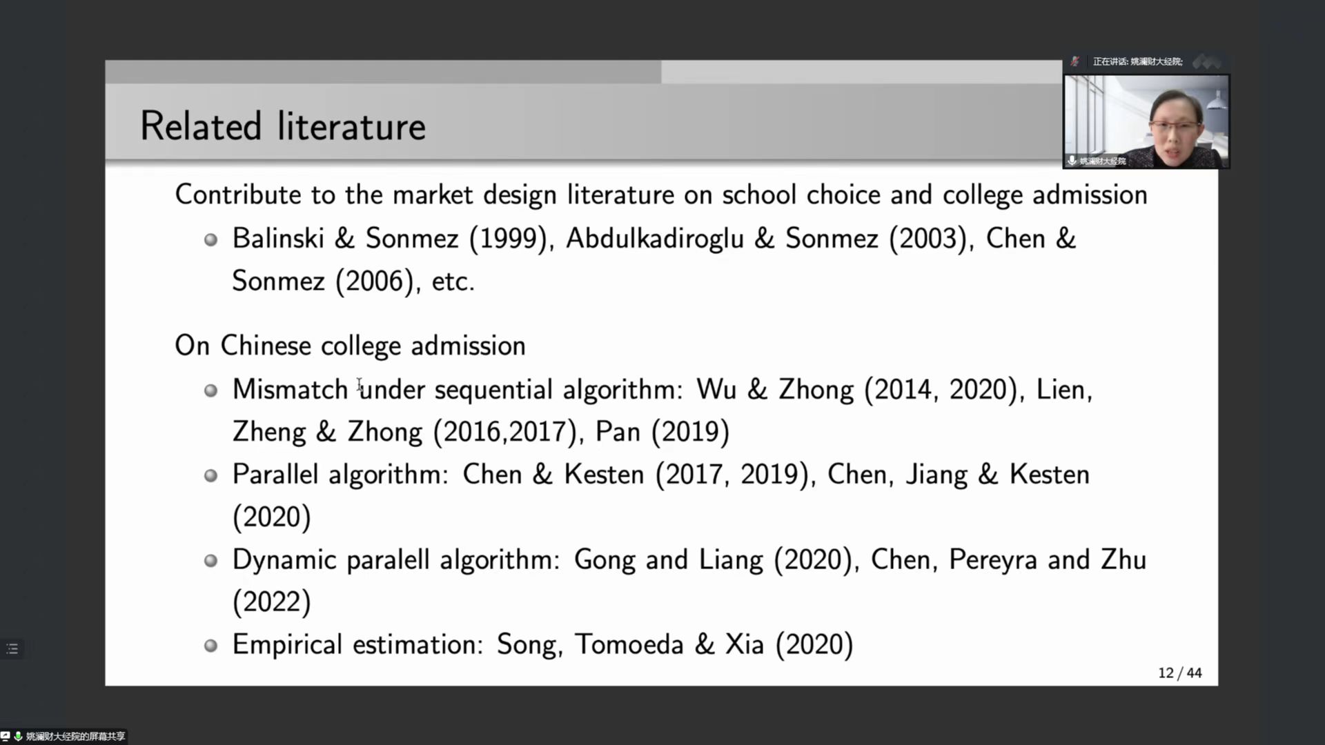 2022年11月23日14:30,山大行为实验经济公开分享荟2022年第11期(总第27期)通过腾讯会议线上举行。姚澜教授做客此次讲坛,讲述的主题为“Two-stage Chinese College Admission”。此次讲坛由蜜桃视频