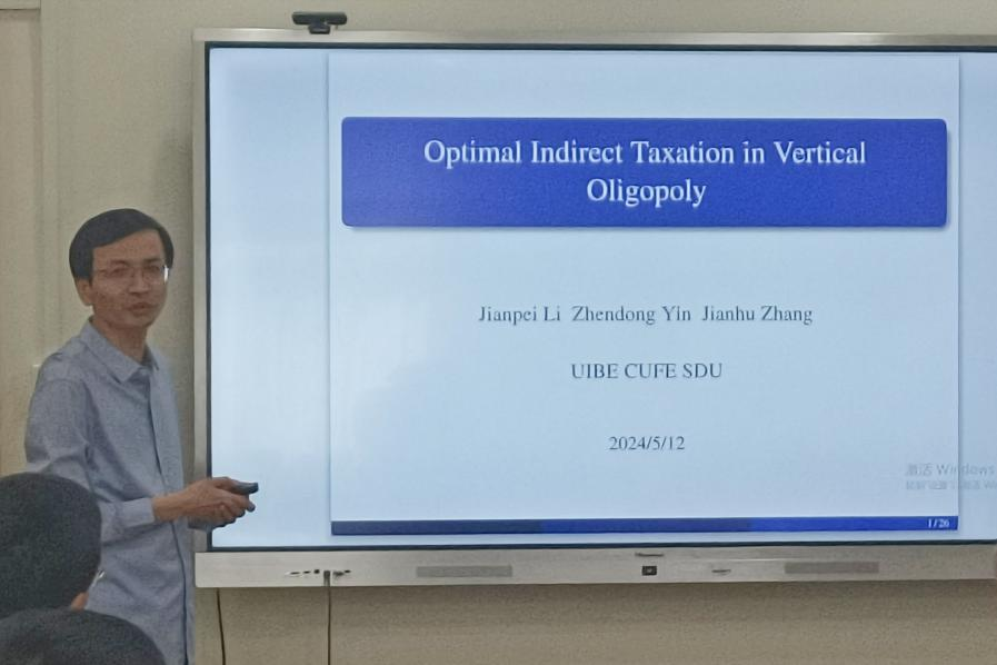 论坛上,中央财经大学经济学院教授尹振东作了题为“Optimal Indirect Taxation in Vertical Oligopoly”的报告。报告提出了一个上下游都有内生进入的垂直寡头垄断模型,讨论间接从价税的最优性。报告指出,当上游企业的进入成本不可忽略时,征收间接税是最优的。这与文献中普遍存在的对上游企业征税不如对下游企业征税的结论形成鲜明对比。其中,驱动力是上下游企业的相对生产效率与税收效率之间的权衡。