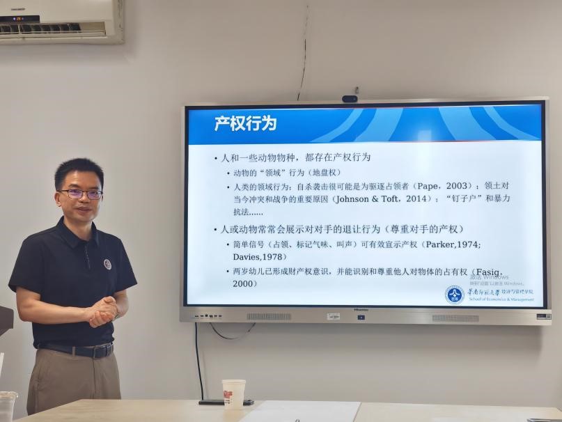 董老师指出理解自发的产权尊重行为对理解产权秩序非常重要。通过一个序贯鹰鸽博弈(Hawk-Dove Game)实验研究了不同产权来源与产权主张和产权尊重行为。研究发现,人们主张产权的态度,在通过努力获得产权时最强烈,通过先占获得产权时次之,靠运气获得产权时最次;而对于他人所主张的产权,人们对先占的产权和努力获取的产权之尊重显著高于随机获得产权的情形;但依靠先占获取产权时争斗最少,依靠劳动获取产权时争斗最多。这表明,产权来源显著影响人们的产权主张和产权尊重行为,先来后到比劳动竞争能更有效地确立产权秩序。董老师认为本研究可视为对洛克、休谟等人的产权先占说和劳动说的实验检验。