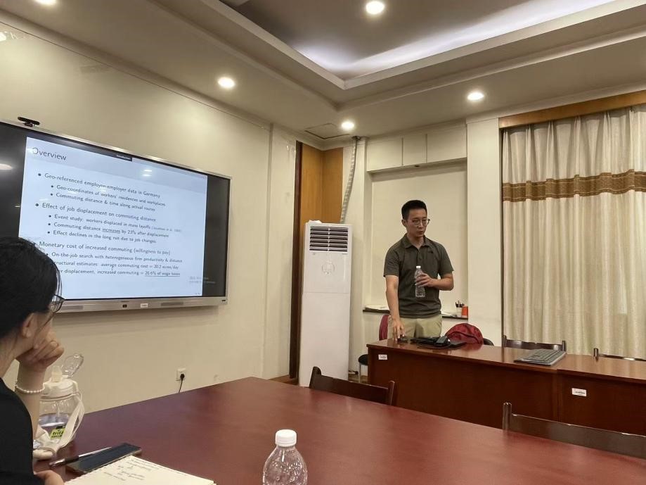 邀请上海交通大学安泰经济与管理学院助理教授段伊戈作题为“Beyond Lost Earnings: Job Displacement and the Cost of Commuting”的学术报告。段伊戈老师于2024年获得英属哥伦比亚大学经济学博士学位,研究方向为劳动和城市经济学。此外,他曾于新加坡国立大学和复旦大学获得经济学硕士和本科学位,并于新加坡国立大学商学院担任研究助理。报告由梁超研究员主持,部分老师和学生参加了本次学术报告。