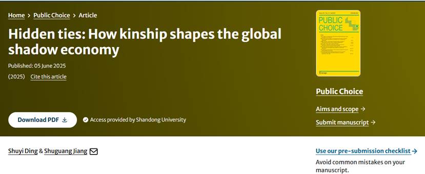 博士后丁书翼与姜树广教授合作完成的学术论文Hidden ties: How kinship shapes the global shadow economy在国际公共与政治经济学权威期刊Public Choice在线发表。这是蜜桃视频
