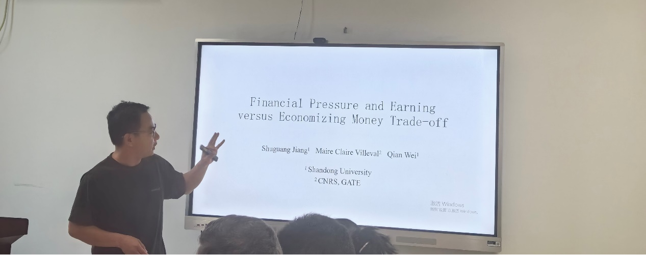 姜树广教授作了题为《Financial Pressure and Earning versus Economizing Money Trade-off》的学术报告,分析了基于“开源-节流”动机权衡的理论框架,系统考察不同维度财务压力对财富积累行为的影响机制。通过三阶段实验设计:(1)实验室实验随机分配高低初始禀赋诱导外生财务压力;(2)中国农村田野实验利用地区收入差异和婚嫁成本识别环境性财务压力,并区分子女数量(即时压力)与儿子数量(预期压力);(3)房产交付前后对比调查实验测量纯心理财务压力。研究发现:环境压力与即时压力会降低财富积累效率,而预期压力与低初始禀赋反而提升任务表现,体现"追赶"补偿动机。该研究揭示了财务压力源与时点的异质性行为影响,为理解家庭财务决策提供了新的理论视角。