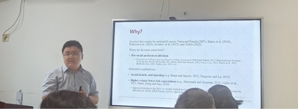 马斯特里赫特大学Peiran Jiao教授作了题为《Sustainable Investment May Backfire: Persistence of Sustainability Preferences》的学术报告,通过实验经济学方法探究了负收益经历对投资者对可持续基金与传统基金的投资偏好影响。研究采用2×2组间实验设计,比较了消费者在仅接受描述性信息和拥有模拟账户投资体验时,在有无明确的可持续项目基金标识两类情景下,对美国大盘股可持续基金与传统基金的投资选择。研究发现:(1)即使可持续基金明确产生环境效益,投资者仍不愿接受较低回报;(2)模拟账户体验显著降低了初始对可持续基金的配置比例,并促使投资策略趋于稳定;(3)尽管投资者随时间推移减少可持续投资配置,但其可持续偏好并未改变,这种调整主要反映了风险与收益的权衡而非可持续性考量。该研究为理解ESG投资行为的驱动因素提供了新证据,表明财务考量仍是投资决策的首要因素,而可持续偏好则表现出较强的稳定性特征。