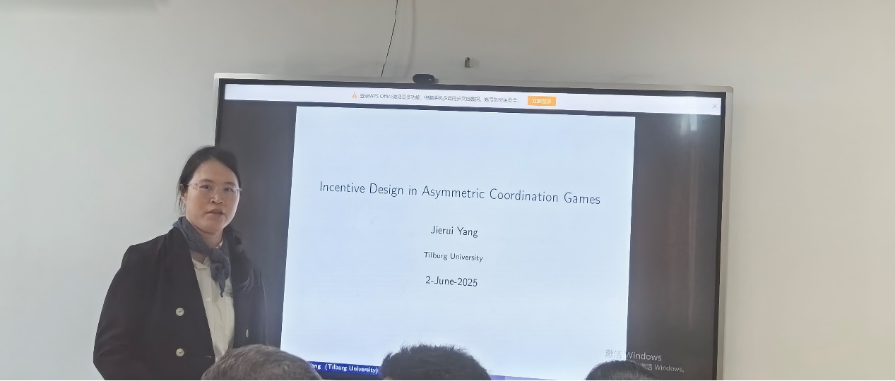 蒂尔堡大学杨洁蕊博士作了题为《Incentive Design in Asymmetric Coordination Games》的学术报告,探讨了如何合理设计利益分配方案促进项目投资协调成功。该研究通过开展实验室实验设置了三种利益分配方案,发现当投资者成本存在差异时,介于按投入比例分配与均等分配之间的折中方案在激励投资行为时最有效。此外研究指出对成本差异的合理性解释是应用该理论预测的前提条件。该研究为协调博弈中的激励机制设计提供了重要理论依据和实践启示。