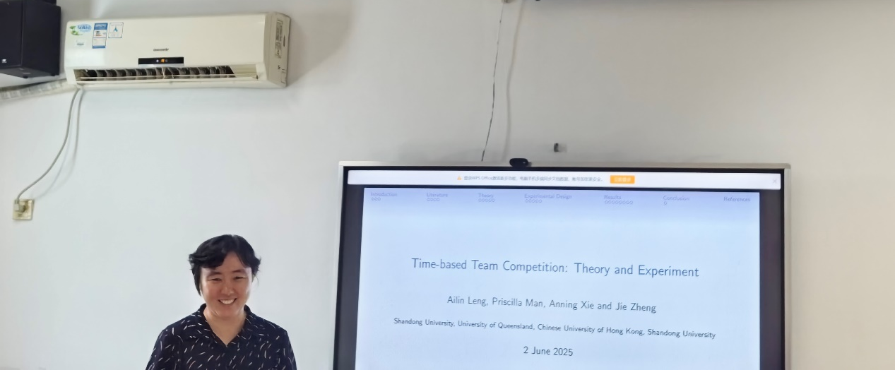 冷艾琳教授作了题为《Time-based Team Competition: Theory and Experiment》的学术报告。该研究创新性地提出了一种连续时间团队竞赛模式。与传统竞赛不同,参赛团队需持续投入努力值,首个累计努力值达到阈值的团队获胜。实验显示,这种设计通过实时竞争压力有效抑制了搭便车行为——参与者自发采用"以牙还牙"和条件合作等策略维持团队贡献。值得注意的是,在均分、按比例分配及内生分配三种奖励规则下,团队总努力贡献无显著差异。该研究为理解实时竞争环境中的团队协作机制提供了新的理论视角和实验证据。
