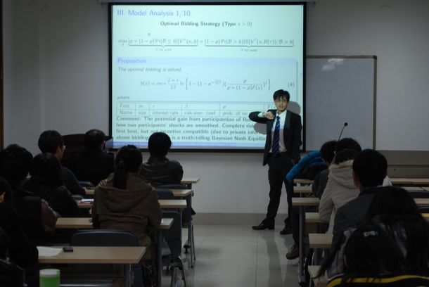 2012年秋季第十期Seminar系列讲座在邵逸夫科学馆513顺利举行。来自香港中文大学的助理教授柯荣住做了题目《为作为保险机制的互助会》的学术报告。吴吉林老师主持了本次报告,孙涛、蒋金山、林晨、吴吉林、孙立新等老师参与了此次讲座。 在本次讲座中,柯老师主要讲解了在存在信贷市场的情况下,互助会的保险机制。文章探讨了保险激励的互助会与正规金融机构的互动,同时检测了不同模型的含义。最后总结得出:在相对更安全或风险更大的环境中,参与的好处会相对低些以及互助会的规模会相对小些。互助会和银行之间既不是替代关系也不是互补关系,尤其是当互助会在社会保险中担当作用时。