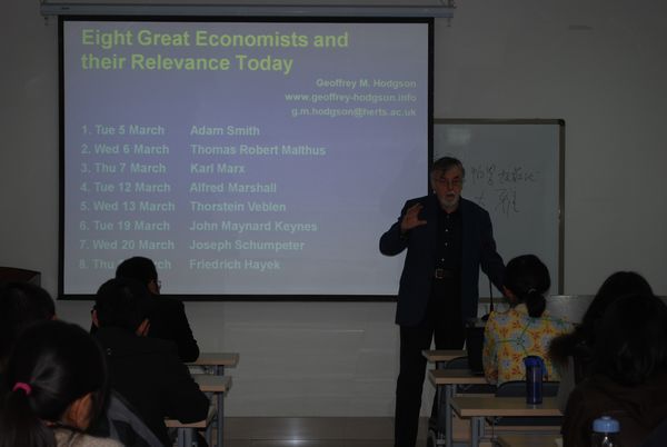 在为期三周的系列讲座中,Geoffrey M Hodgson教授为同学们讲述了八位世界知名经济学家的生平、学术成果及他们对当代经济学界的影响。这八位经济学家分别是Adam Smith、Thomas Robert Malthus、Karl Marx、Alfred Marshall、Thorstein Veblen、John Maynard Keynes、Joseph Schumpeter 和 Friedrich Hayek。
