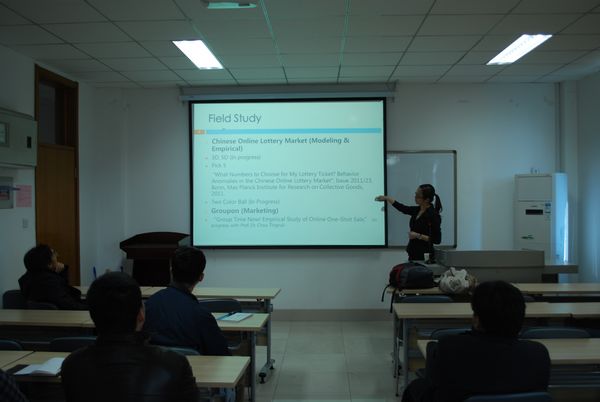 2013年第五期Seminar(总第35期)系列讲座在邵逸夫科学馆513举行。来自Max Planck Institute for Research on Collective Goods的丁洁瑶博士做了题目为What Numbers to Choose for My Lottery Ticket? Behavior Anomalies in the Chinese Online Lottery Market的学术报告。本次报告由黄凯南老师主持,周洪涛、侯麟科、蒋金山和隋鹏老师等参与了此次讲座。