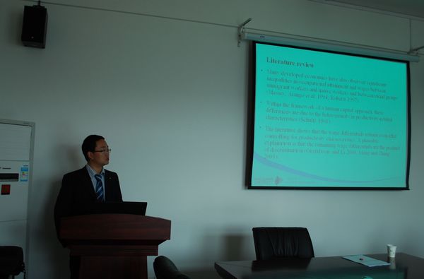 2013年第九期seminar(总第39期)系列讲座在邵逸夫科学馆401室举行。来自澳大利亚Macquire大学工商管理学院的王海宁博士做了题目为《A Distributional Analysis of Wage Discrimination against Migrant Workers in China’s Urban Labour Market 》的学术分析报告。本次报告由黄凯南老师主持,林晨老师和侯麟科老师等参加了此次讲座。