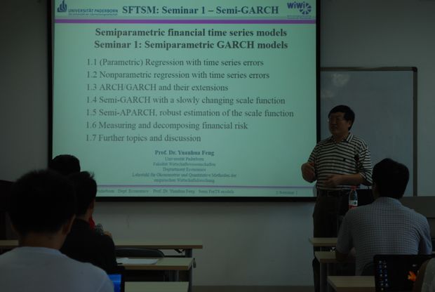 硕士生与博士生参与了此次讲座。冯教授从对计量经济学的ARCH模型与GARCH模型的基本介绍开始了这次讲座,这两个模型在应用中有非常多的扩展形式,例如TGARCH(Threshold GRACH)模型,APARCH模型(Asymmetric Power ARCH)等,这些模型都可以对平稳回归序列进行很好的构建。由于变动的宏观经济环境所带来的规模函数的缓慢变动,金融回报率在现实中是非平稳的。正是为了解决这个问题,提出了半参数GARCH模型,由一个参数GARCH模型和非参数平滑来实现。不同的半参数GARCH模型可以解决很多重要的理论问题,也可以将金融风险进行分解。半参数GARCH模型也可以扩展到多元的情况下,来提高对资产组合或宏观经济风险的估计。基于半参数GARCH模型也可以提出更有效的政策建议。