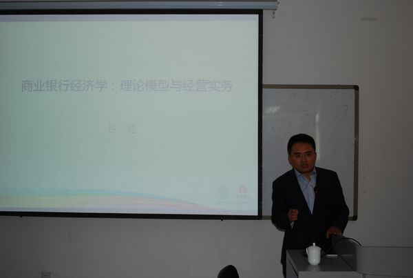 赵建博士首先从理论上简要介绍了含有商业银行的动态一般均衡(DSGE)和局部均衡模型,讲述了构建商业银行模型的一般方法。其次,赵建博士以理论模型为出发点,介绍了当前我国商业银行的总体经营轮廓(负债、资产、风险等),解释了近期商业银行面临的热点问题,如:钱荒、互联网金融、同业鸦片等,以及面对金融新常态商业银行的转型路径。最后赵建博士对我们寄语:金融市场化需要专门人才,在学校期间除了做好学术功课,还要多读书,要涉猎于经济、历史、社会等各个领域。