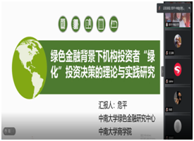防范和管理由环境因素所带来的金融风险是目前金融业促进可持续发展并保障金融系统稳定性的重要内容,危平教授基于此阐述了绿色金融背景下机构投资者“绿化”投资决策的微观机理、途径和财务/环境双重绩效评价。具体说来,首先围绕不同类型机构投资者“绿化”动机的多元性和复杂性,从社会责任投资、环境风险管理和金融创新视角探究绿化投资决策的动机研究;从前端契约设计及其效率评价,后端的投资策略选择及其双重绩效评价来阐述绿化投资决策的实施及其效应方面的理论和实证研究;从资本市场的“绿色有效性”来探讨绿化投资决策的市场条件及制度建设方面的理论和实证研究。研究目的是引导机构投资者在资本市场承担更积极的环境治理角色。参会师生就环境风险的识别与评价、生物多样性金融、金融科技与绿色金融等研究方向与危平教授展开了讨论。
