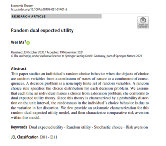 马伟副研究员在Economic theory在线发表论文《Random dual expected utility》,马伟博士为独立作者,蜜桃视频