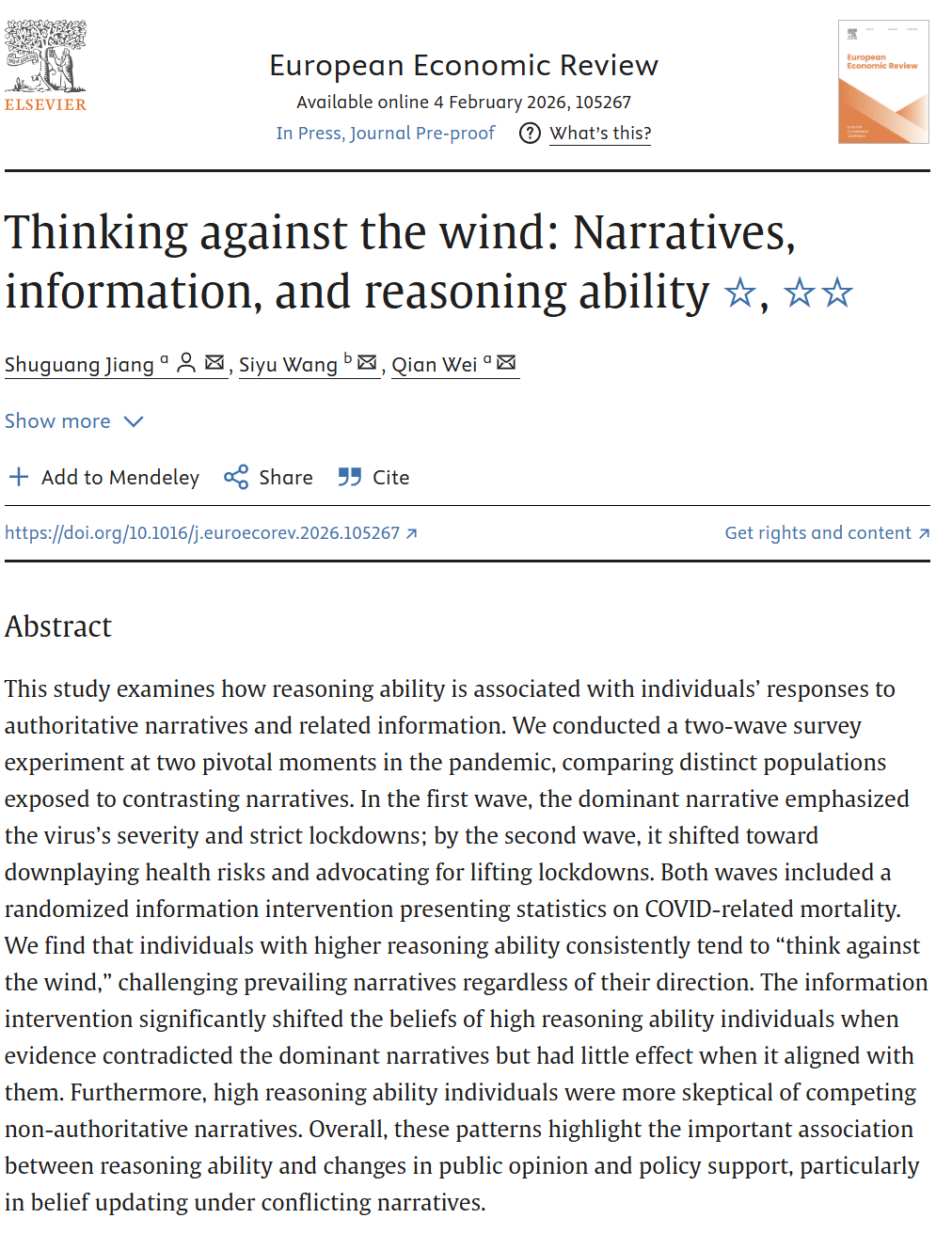 姜树广教授、韦倩教授与维拉诺瓦大学汪斯妤副教授的合作论文“Thinking against the wind: Narratives, information, and reasoning ability”在经济学领域国际顶级期刊European Economic Review在线刊出。韦倩教授为论文共同第一作者,姜树广教授为共同一作和通讯作者。European Economic Review 创刊于1969年,是欧洲历史最悠久的综合性经济学期刊之一。期刊致力于发表覆盖经济学各个领域的理论与实证研究,旨在遴选在广泛议题上具有高度相关性和学术影响力的论文。该刊为蜜桃视频