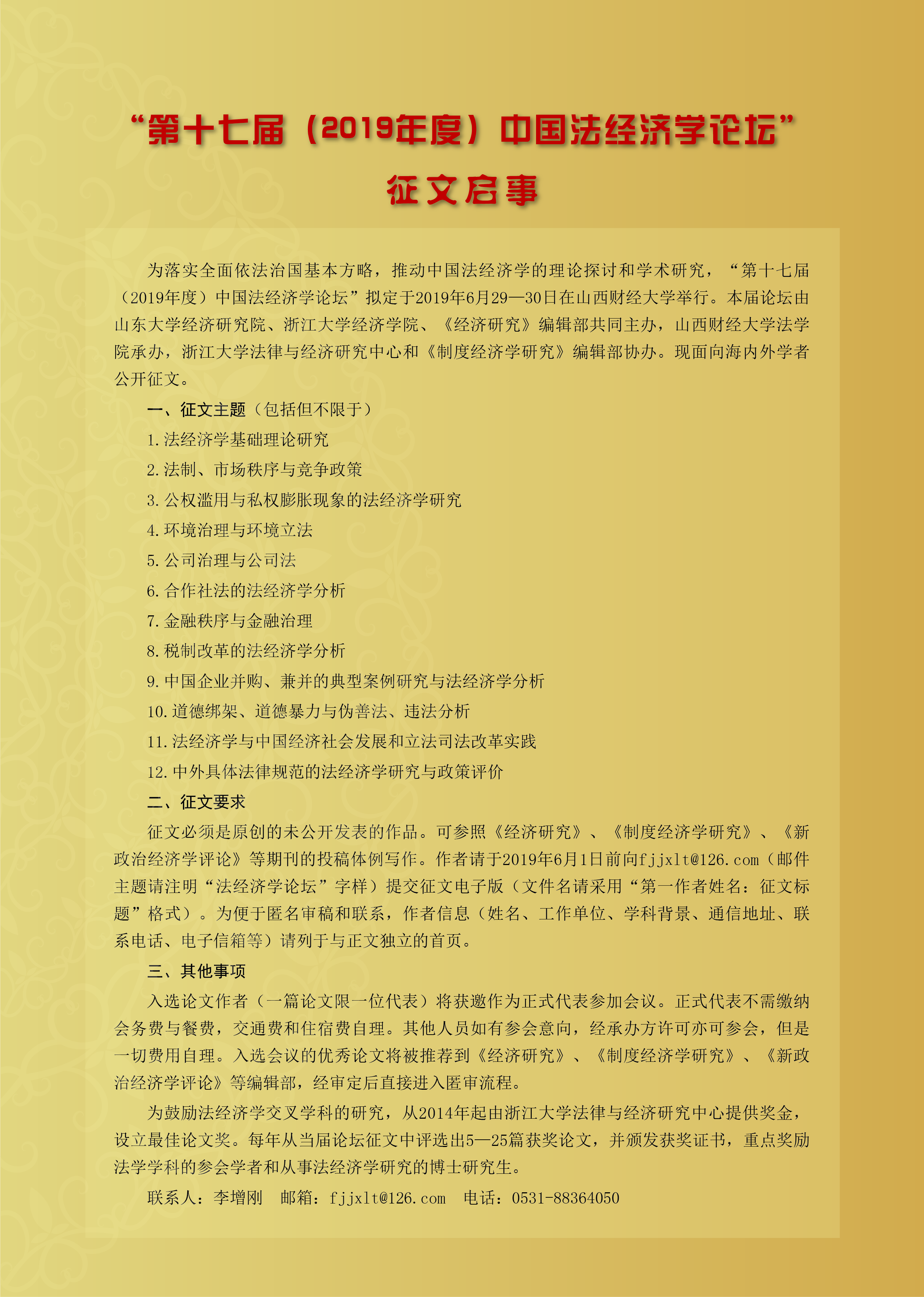 “第十七届(2019年度)中国法经济学论坛”征文启事