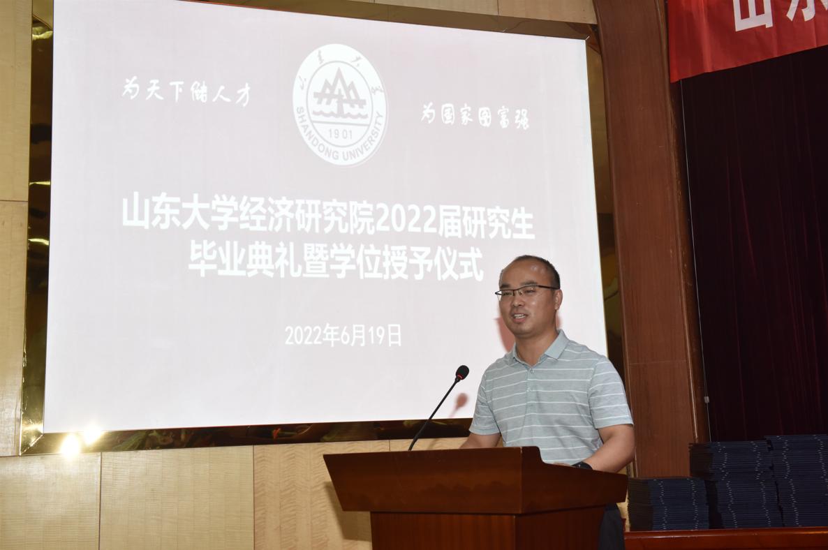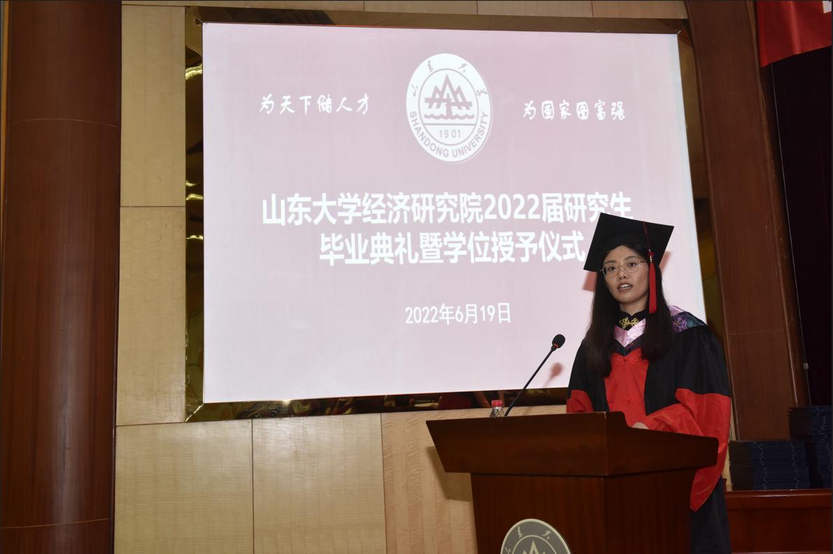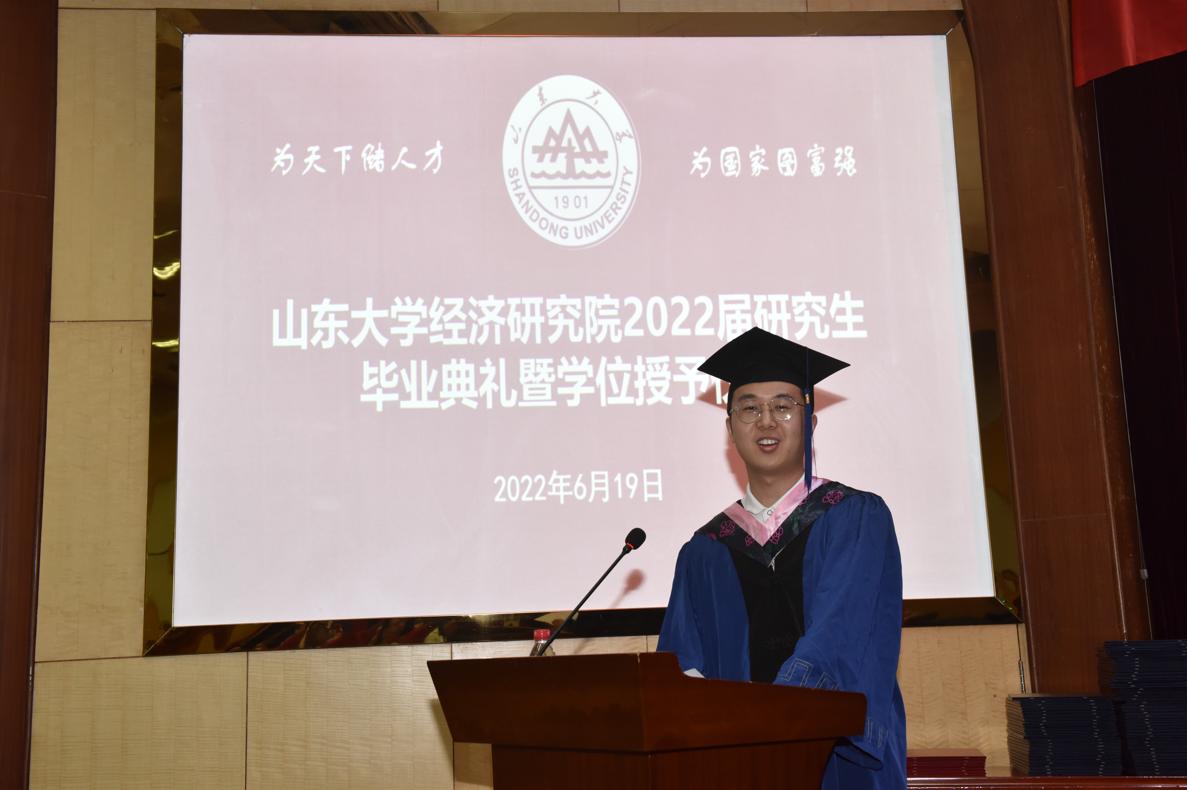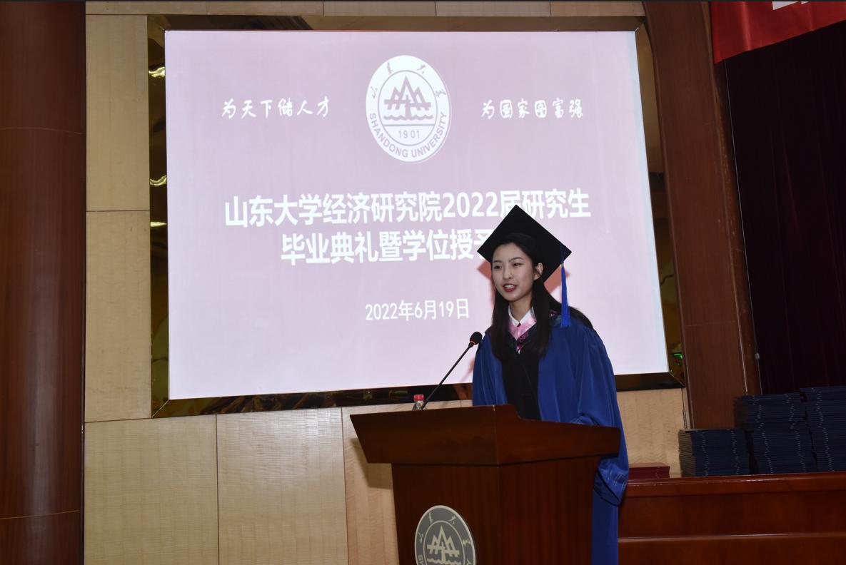随后,在校研究生代表致辞。2021级硕士李加红感谢师兄师姐在生活学习上的帮助,他们悉心的答疑解惑与课后辅导使自己又找到学习动力,并祝愿学长学姐们山高路远,风光无限。2021级博士张荣杰感谢学院提供了宝贵的学术平台以及在日常生活、科研工作等诸多方面的帮助。并提及在研究生生涯中,大小事件不断交汇,从见证者到参与者的转变过程中,离不开国家与社会的支持,离不开山大经研院老师们的培养,离不开家长的支持,鼓励大家将个人命运投入到国家、社会的发展需要中去。
