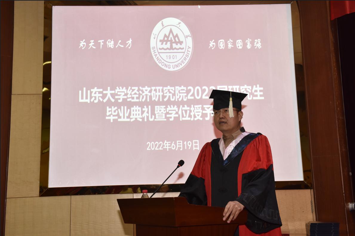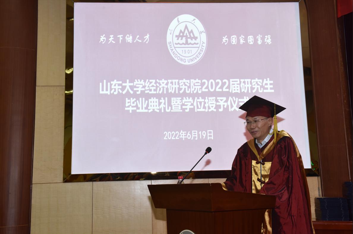 院长黄少安教授致辞。黄少安院长讲到经济学原理无处不在,今后工作、生活中所看到的现象,其原理均包含在所学的经济学知识当中,“节约、互利、均衡”不仅仅是经济学的科学精神,也是工作或生活当中的人生节选。寄语毕业生同学:在不同的岗位上要坚持理想,发扬经研人的风骨;祝愿大家在新的工作岗位上守住底线,讲科学、讲法治、干实事,并不断突破上限,创造新的辉煌。