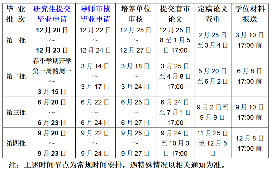 研究生每年有四次毕业机会,各批次毕业生申请、导师审核时间安排如下: