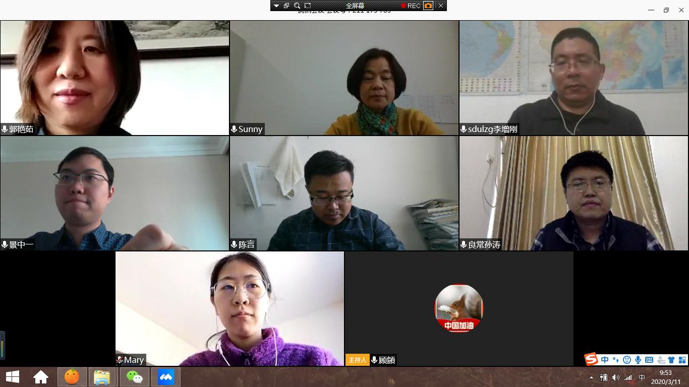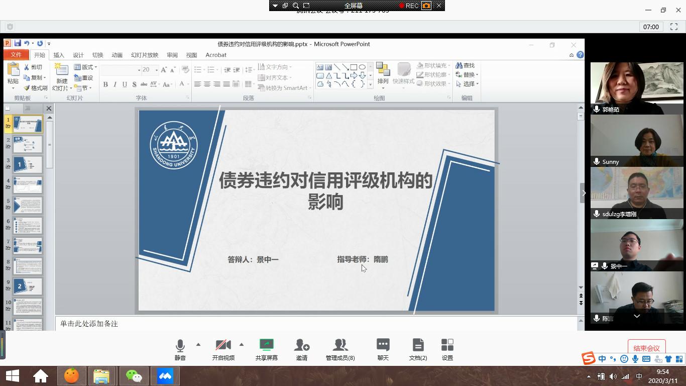 视频答辩利用腾讯会议平台进行。与普通现场答辩不同的是,此次远程视频答辩会的所有成员虽都同处一市但都地处不同。答辩委员会成员共5人:主席由山东财经大学郭艳茹教授担任,委员由蜜桃视频 的王凤荣教授、孙涛教授、李增刚教授、陈言副教授担任。