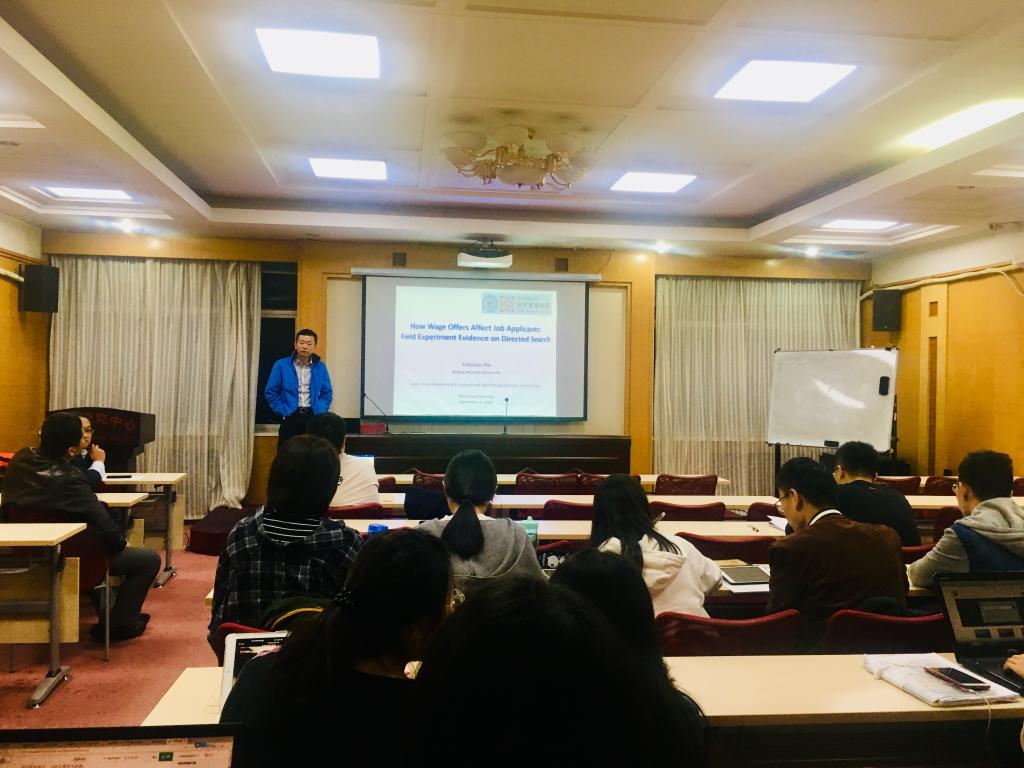 2019年第8期博士生高端论坛在中心校区邵逸夫科学馆第五会议室举行,北京师范大学何浩然教授应邀作“How Wage Announcements Affect the Quantity and Quality of Job Applicants: Field Experiment Evidence on Directed Search”主题报告,活动由蜜桃视频