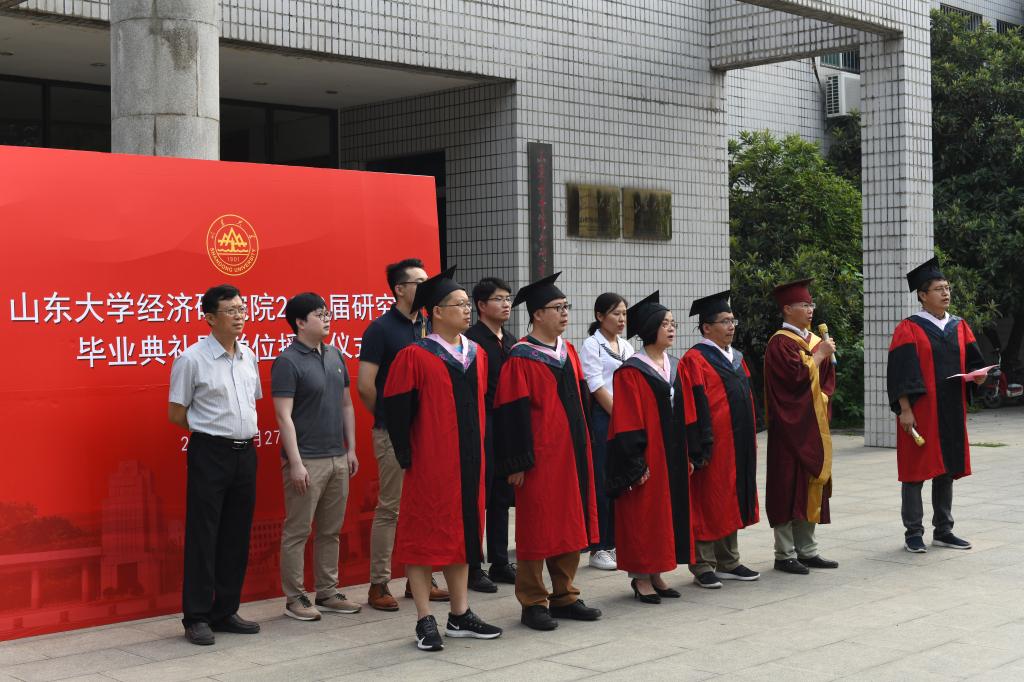 院长、学位评定分委员会主席黄少安教授宣读学校授予学位决定并讲话。对各位毕业生表达祝贺,勉励全体毕业生在2020年这一特殊的毕业年份坚定理想信念、实现人生价值、展现经研风采,同时以疫情为契机重新理性认识人与自然的关系、正确看待我国“抗疫”过程中的制度优势与提升空间,在未来的人生中践行科学的学习、工作和生活方式。随后,在悠扬婉转的《我的山大我的家》歌声中,黄少安院长为返校的9名博士毕业生、79名硕士毕业生一一拨穗并颁发学位证书。仪式最后,全体2020届毕业生与学院学位评定分委员会委员、学院导师代表合影留念。