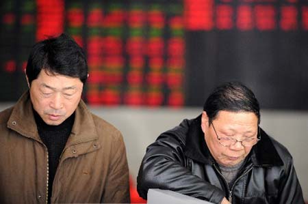 Two stock investors look over information at a stock exchange in Hefei, capital of East China's Anhui Province, Feb. 26, 2008. The benchmark Shanghai Composite Index closed at 4,238.18 on Tuesday, a gain of 45.65 points. The Shenzhen Component Index lost 158.25 points, or 1.02 percent, to end at 15,328.42. (Xinhua Photo)